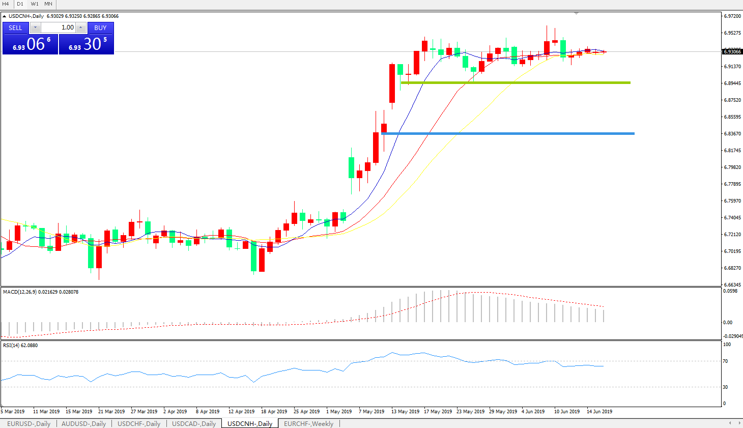 技术面简析:日线均线粘合延续整理MACD0轴上方运行但动能柱持续缩量RSI下穿超卖区域后走平,预计短期汇价有整理回落需求,中期重点关注中美贸易争端后续进展