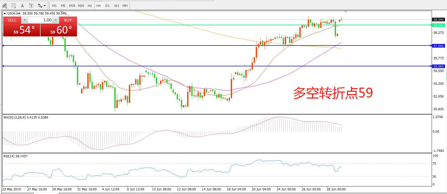 4小时图看,油价跳空高开,再次站在59一线之上, 均线系统开始拐头,MACD红柱减少, RSI指标走平,日内区间震荡概率较大。