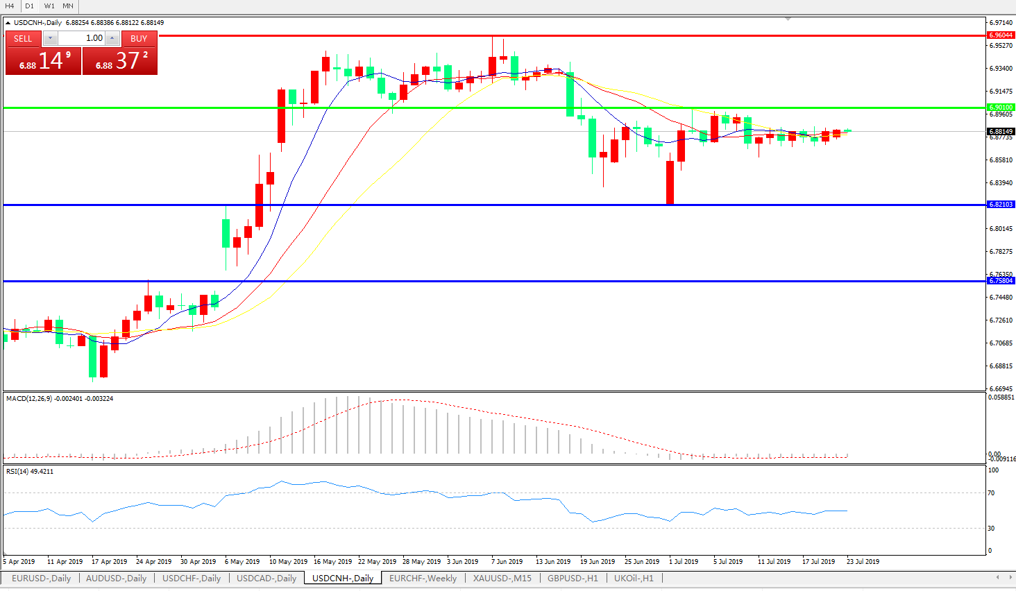 交易策略: 在6.9010之下,看跌,目标价位为6.8210,然后为6.7580。