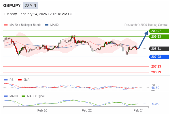 英镑/日元 当日内 : 有上涨的可能,目标价位定在 209.97 。