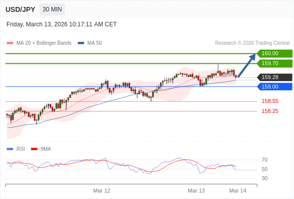 在 159.00 之上,看涨,目标价位为 159.70 ,然后为 160.00 。