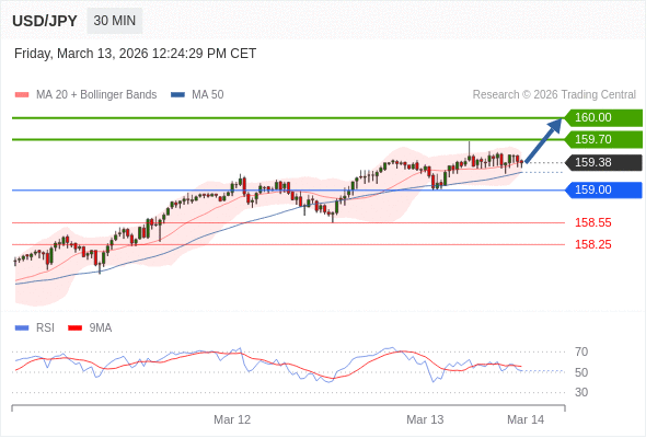 在 159.00 之上,看涨,目标价位为 159.70 ,然后为 160.00 。