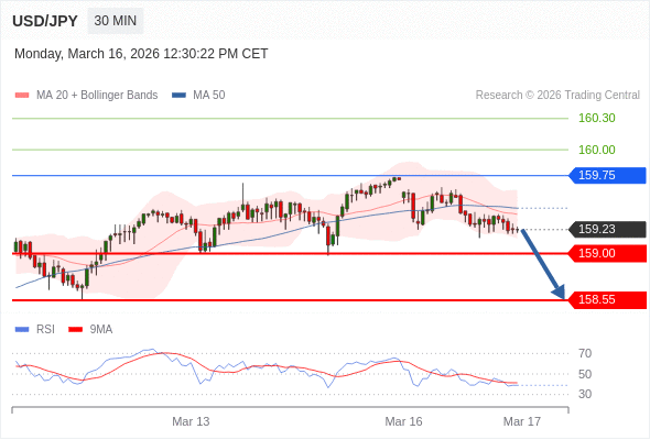 交易策略: 在 159.75 之下,看跌,目标价位为 159.00 ,然后为 158.55 。