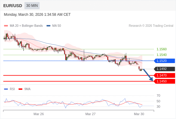 在 1.1520 之下,看跌,目标价位为 1.1470 ,然后为 1.1450 。