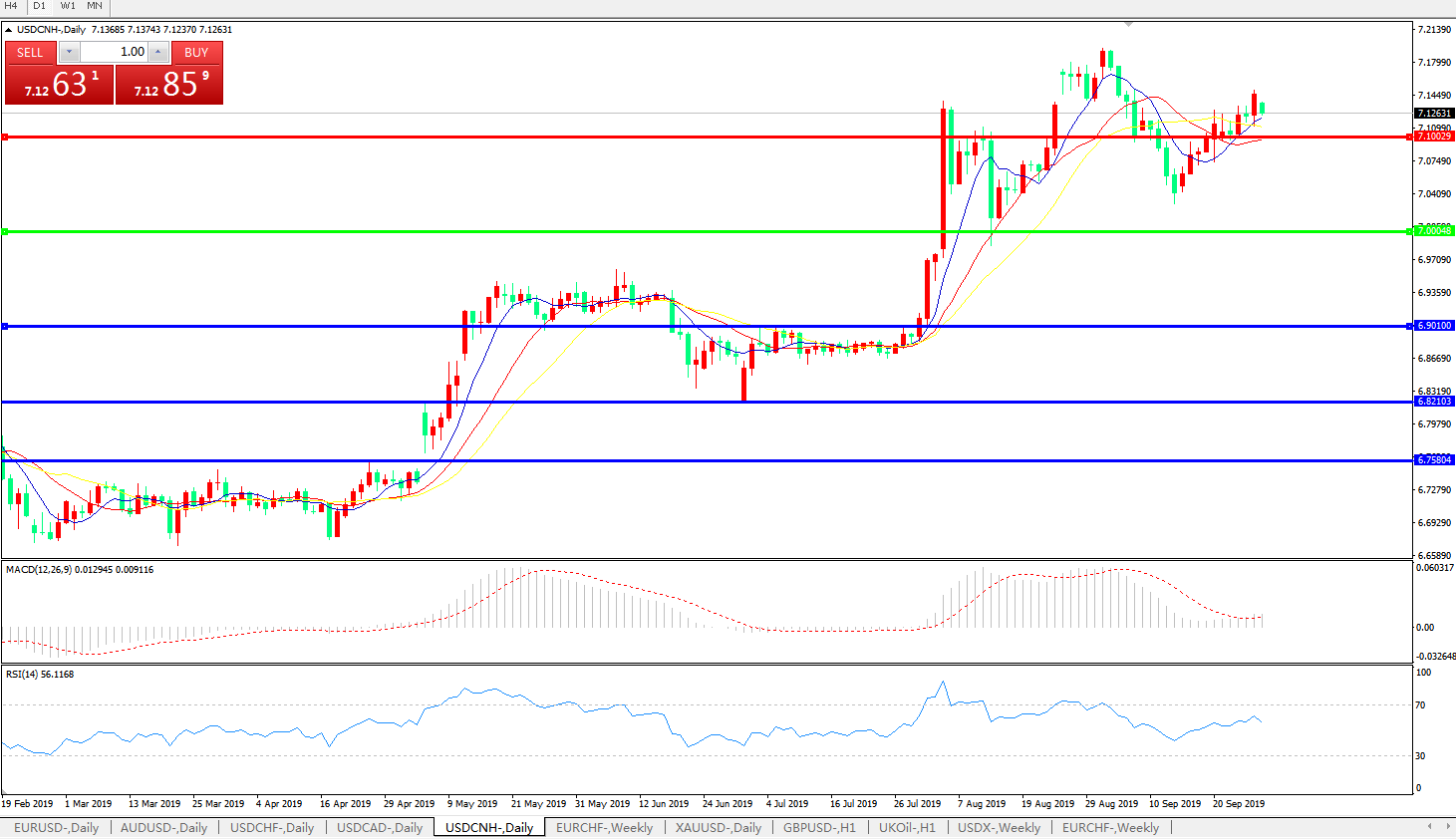 技术面简析:日图短期均线逐步呈攻势,汇价站稳7.10关口延续小幅上攻,MACD逼近0轴但动能有再度放量迹象,RSI短期走高告一段落,预计短期汇价有小幅回落风险,上方重点关注7.20-7.30区间的压制;中美贸易谈判进展须持续关注。