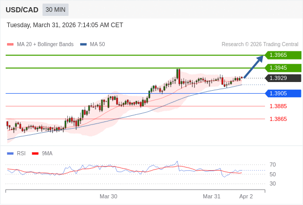 在 1.3905 之上,看涨,目标价位为 1.3945 ,然后为 1.3965 。