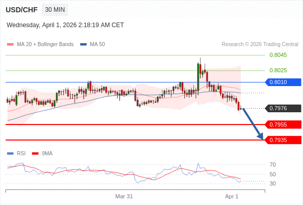 在 0.8010 之下,看跌,目标价位为 0.7955 ,然后为 0.7935 。