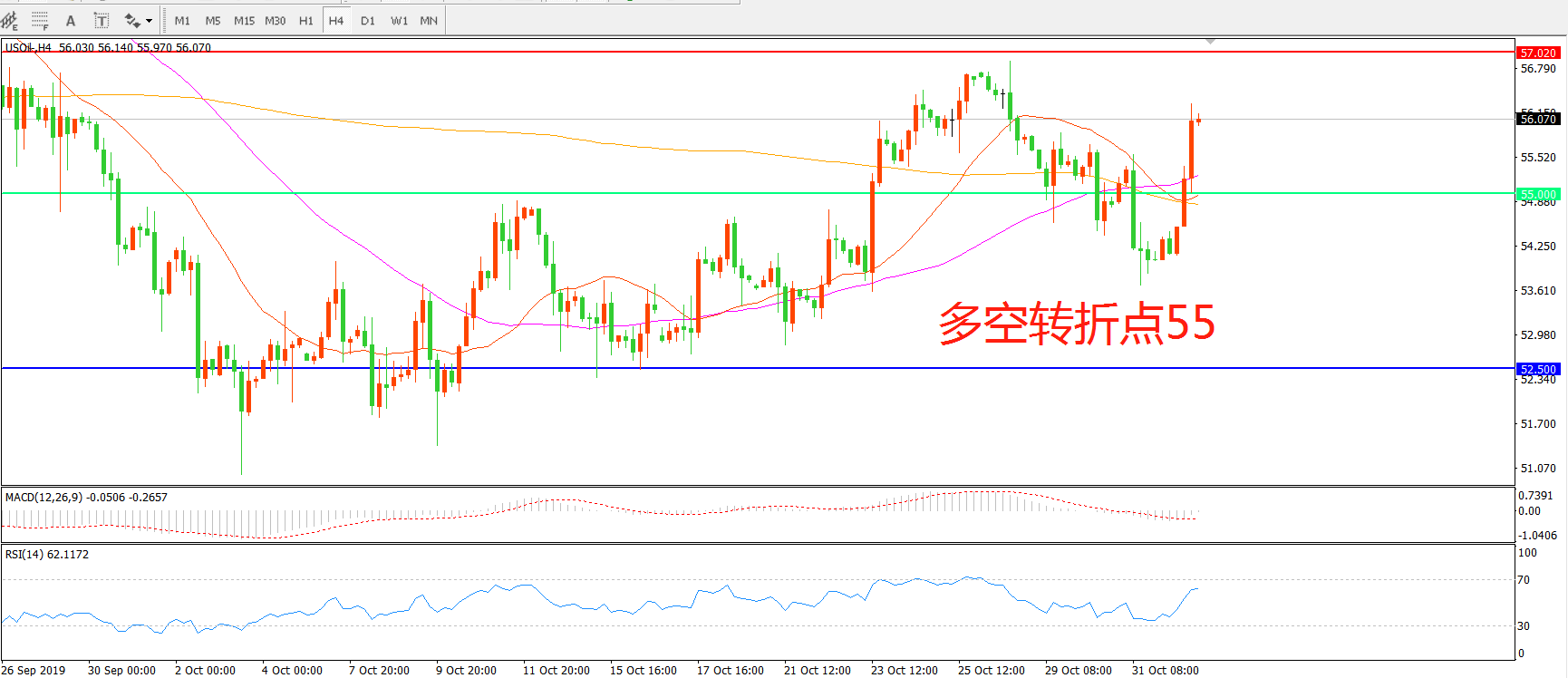 4小时图看,油价阳线连续拉升,再次回到55美元一线之上,均线系统粘合,MACD绿柱缩短,RSI指标走平,日内油价延续上行概率较大。