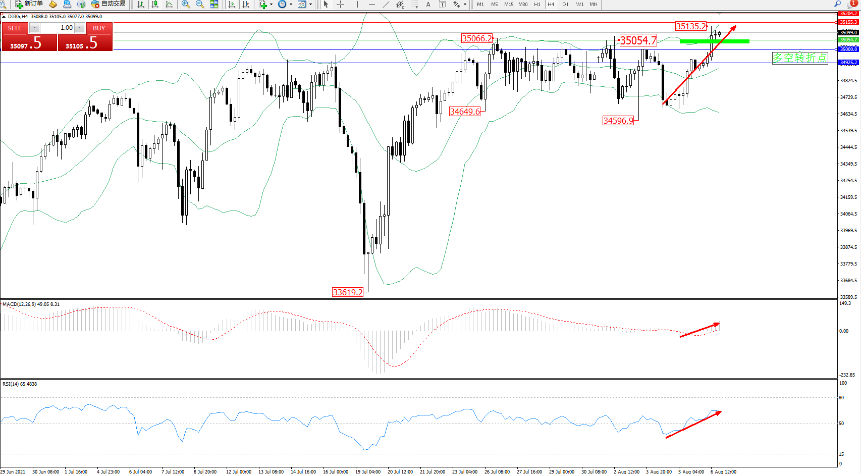 道琼斯指数DJ30——4小时K线图显示:
