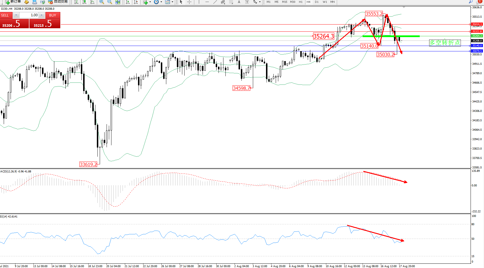 道琼斯指数DJ30——4小时K线图显示: