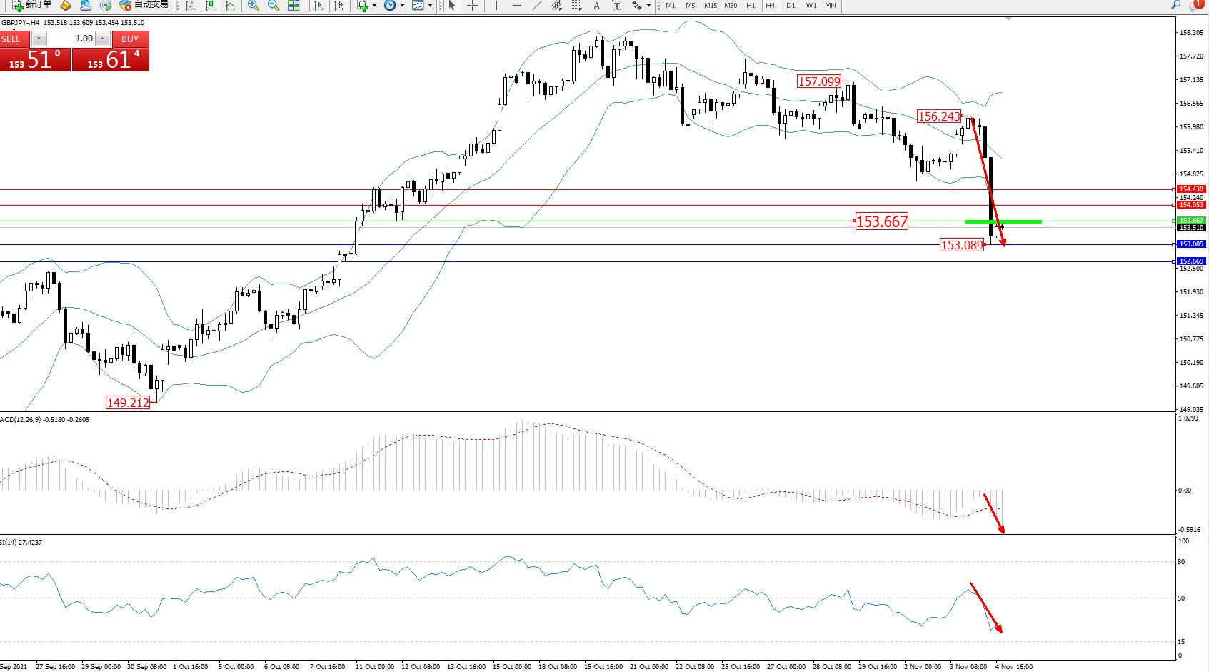 交易策略:153.667下方看跌,目标153.089、152.669