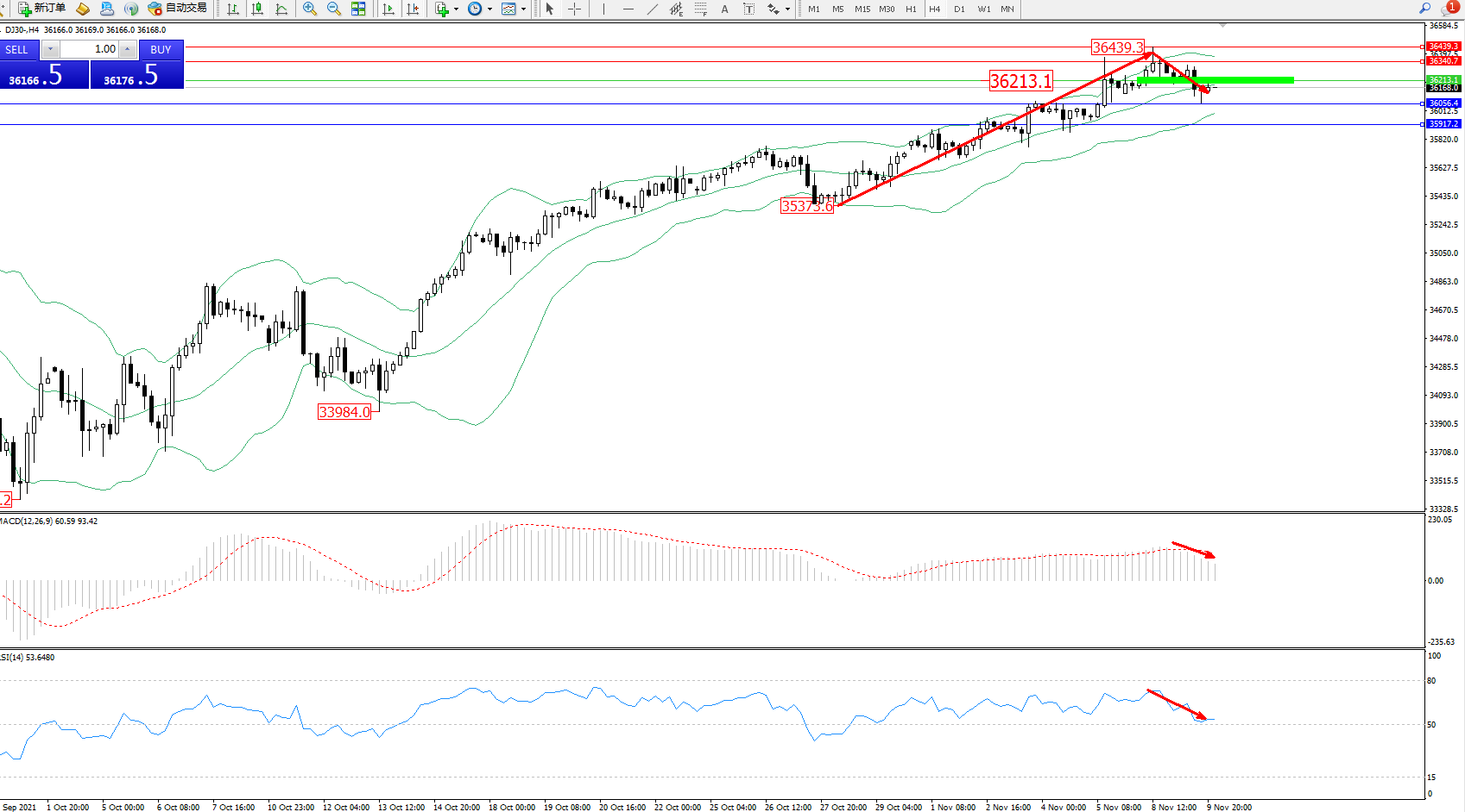 道琼斯指数DJ30——4小时K线图显示:
