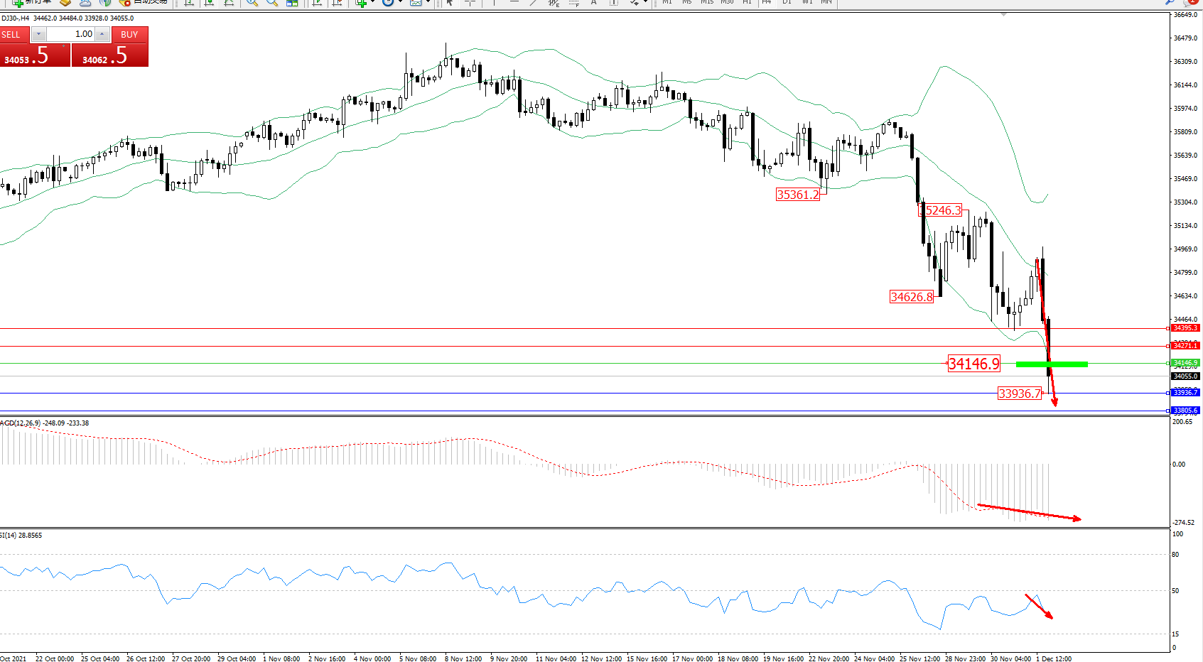道琼斯指数DJ30——4小时K线图显示:
