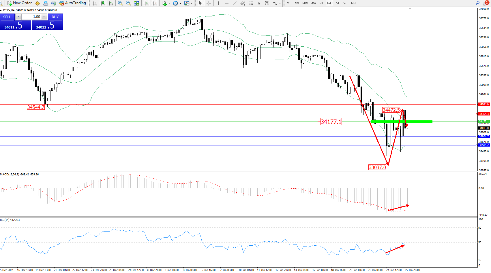 道琼斯指数DJ30——4小时K线图显示: