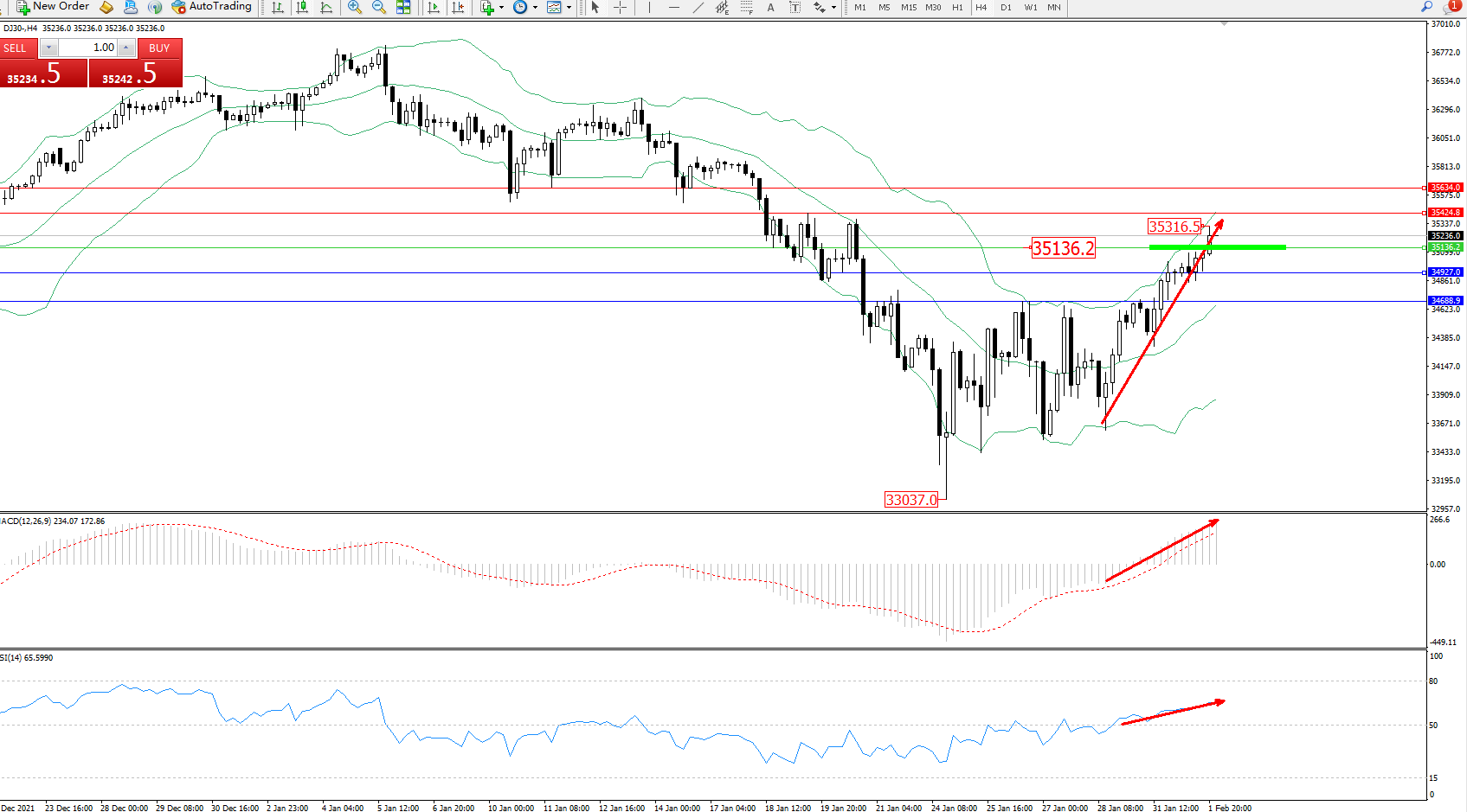 交易策略:35136上方看涨,目标35424、36634