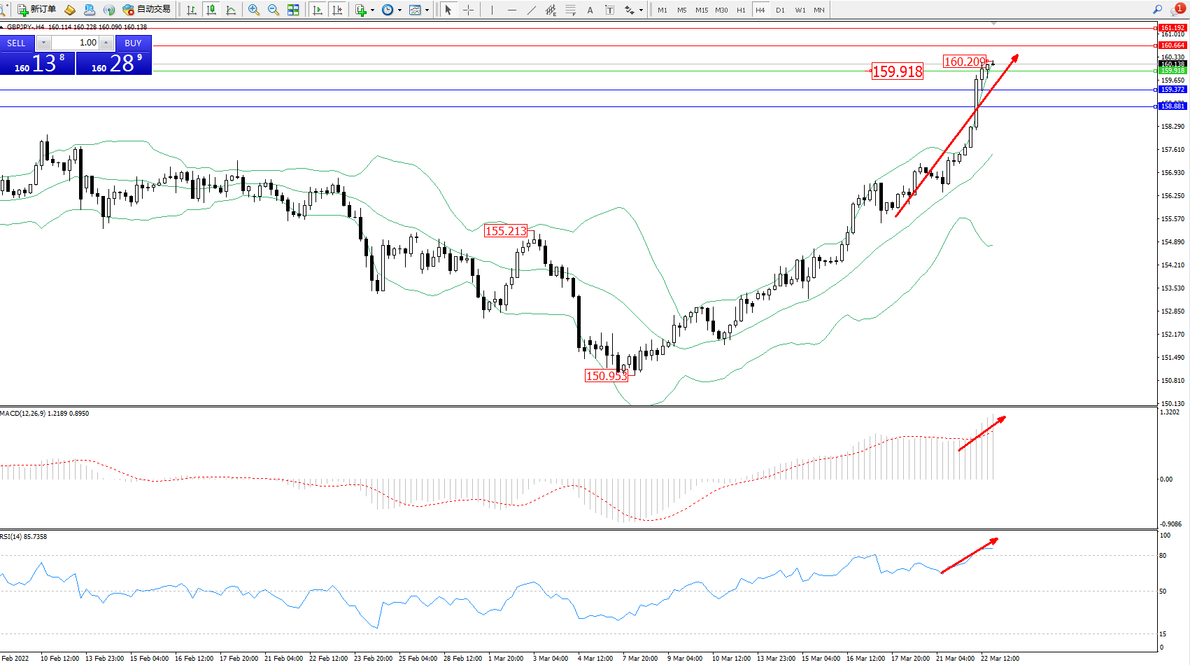 技术点评:多头动力延续布林带指标通道中上轨区间持续震荡上扬,高位抵达160.209附近节点后开始整理,短期多头拉升上扬动力或将持续,布林带指标呈上行趋势走势后开始缓慢张口,且多头上扬未见最终止步迹象,MACD指标处于多头区域维持震荡上扬,RSI指标处于多头区域超买区80均衡线上側徘徊中;