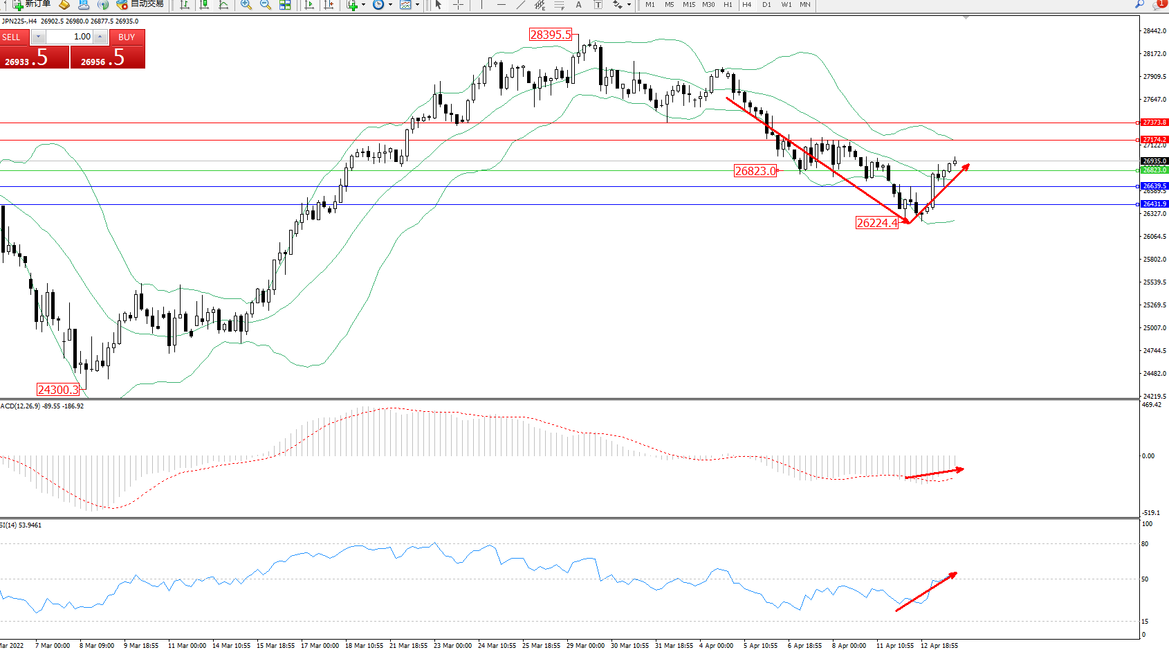 日经指数JPN225——4小时K线图显示: