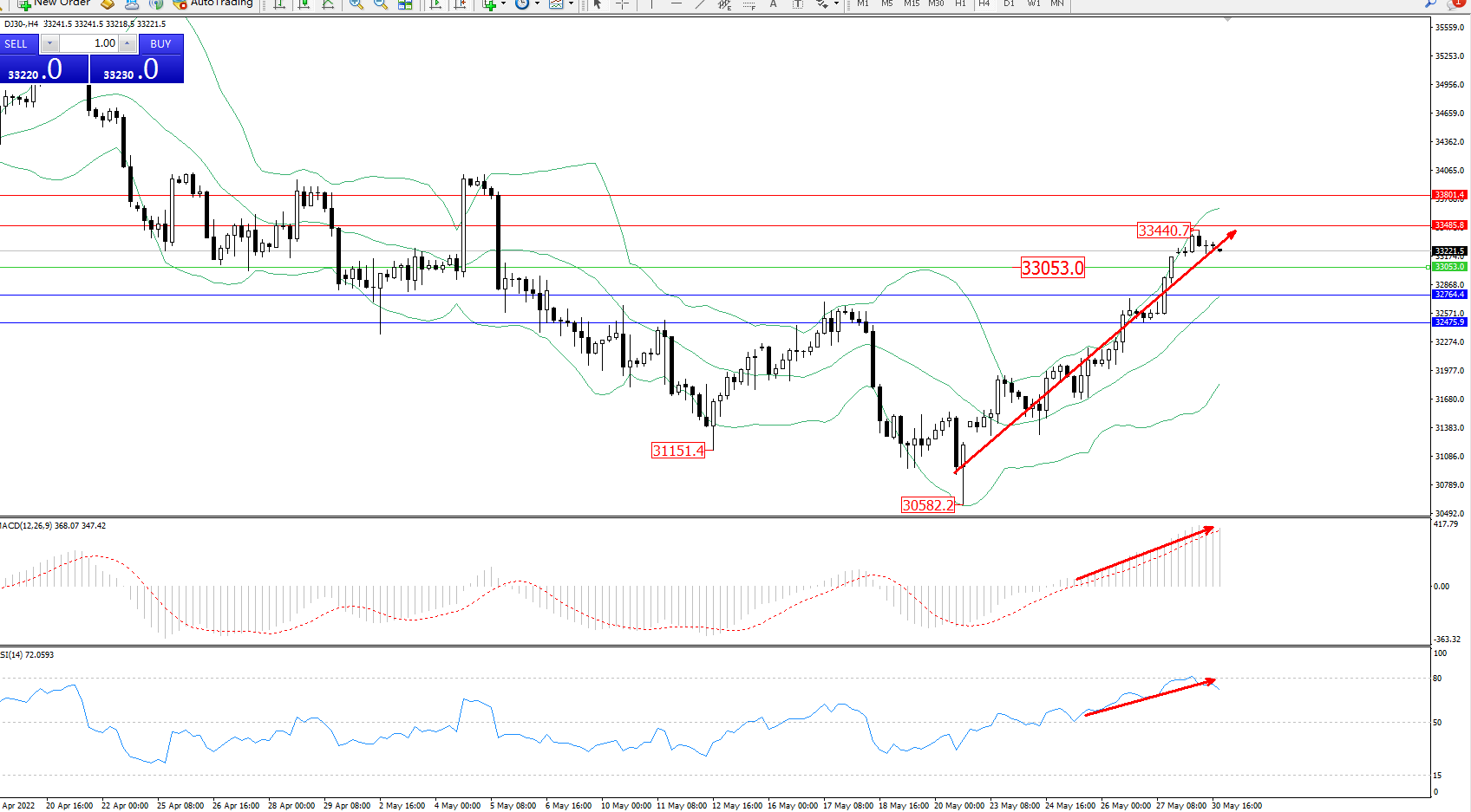 道琼斯指数DJ30——4小时K线图显示: