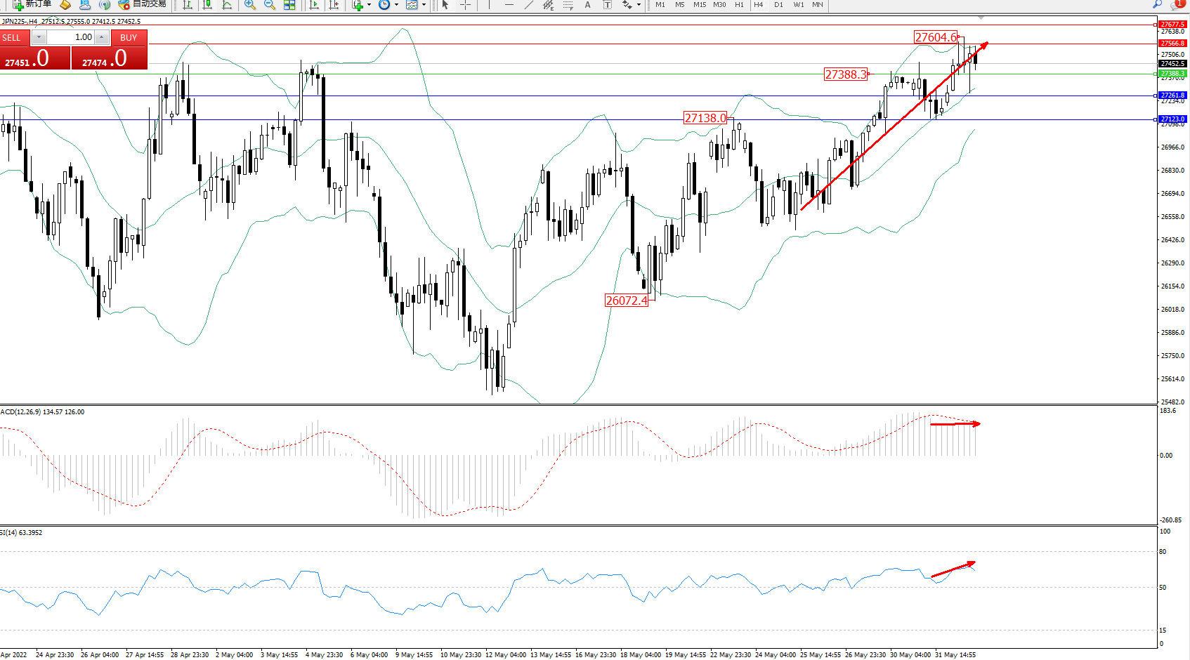 日经指数JPN225——4小时K线图显示: