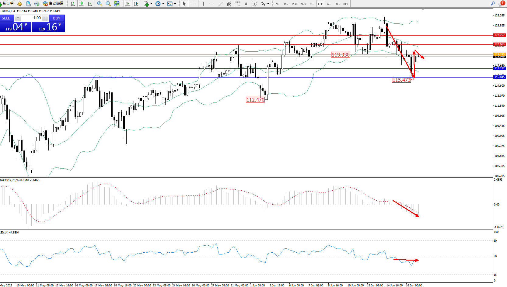 布油维持119.049附近震荡,随着供应中断和需求强劲共同推动油价上行,布伦特原油价格将有可能在下个季度进一步上涨20%,达到约150美元/桶。
