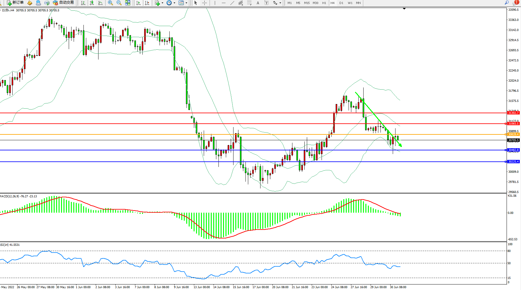 道琼斯指数DJ30——4小时K线图显示:
