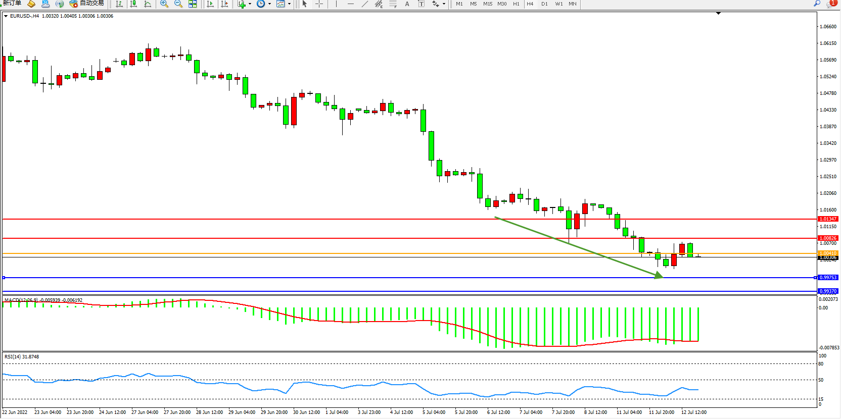 交易策略:1.00410下方看跌,目标0.99753、0.99370