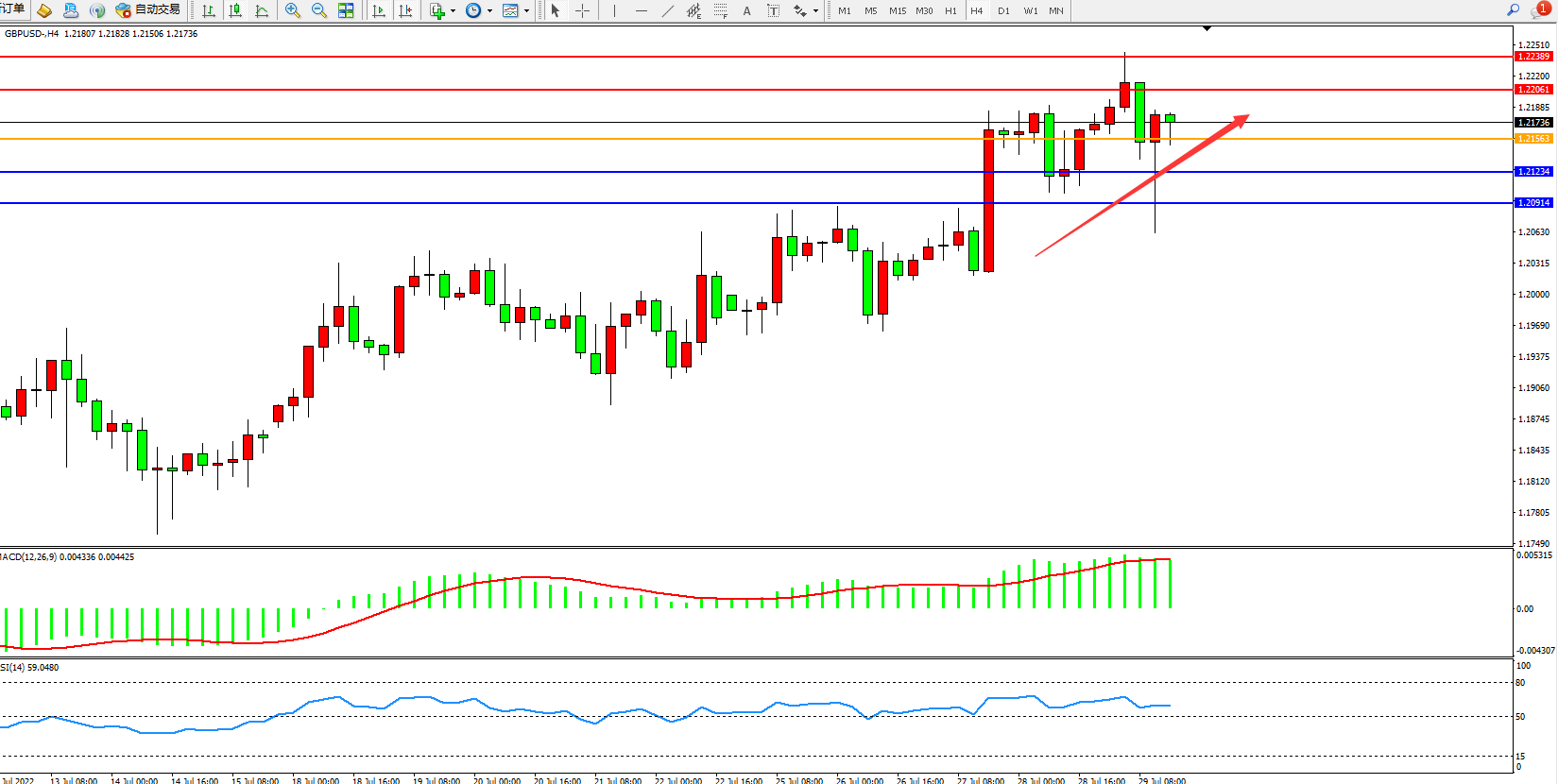 交易策略:1.21563上方看涨,目标1.22061、1.22389