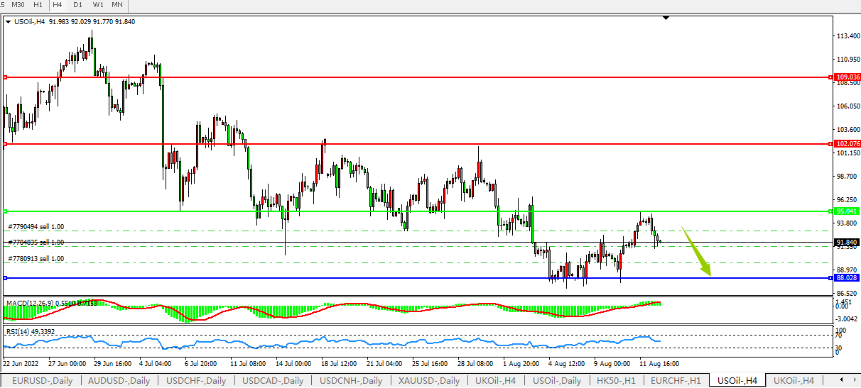 4小时图看:油价反弹触及95压制区域后快速下行, MACD量能柱0轴上方缩量,RSI指标小幅回落,短期价格继续下行概率较大。