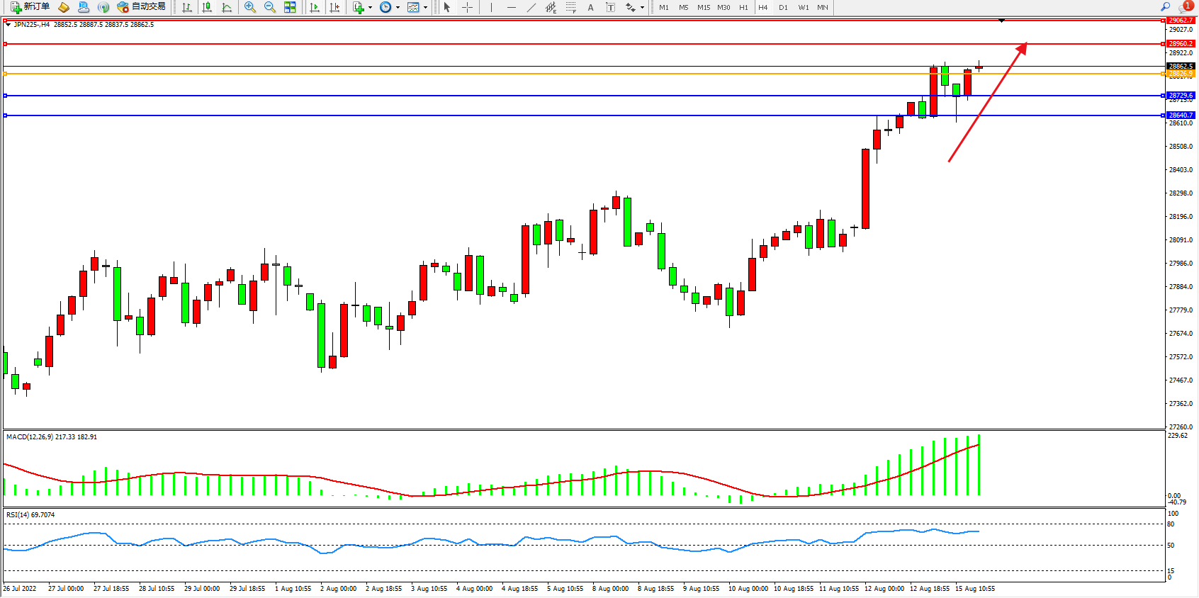 日经指数JPN225——4小时K线图显示: