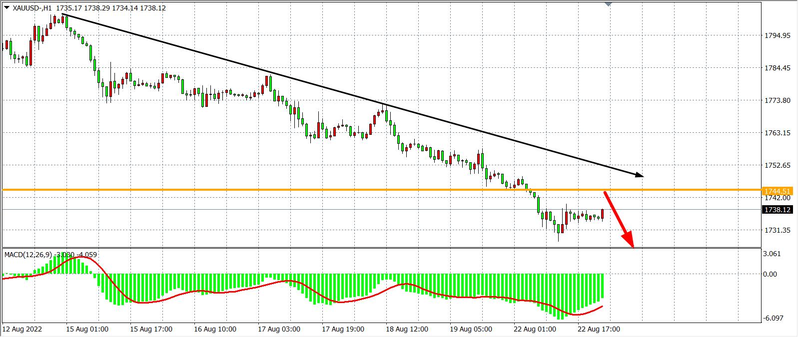 1小时图看,金价相继跌破支撑,趋势呈完好下跌形态,当前阻力下移至1744.50,MACD于零轴之下维持较大空头量能,显示行情或延续跌势,日内在1744.50之下继续看跌为主,下方目标1730-1720