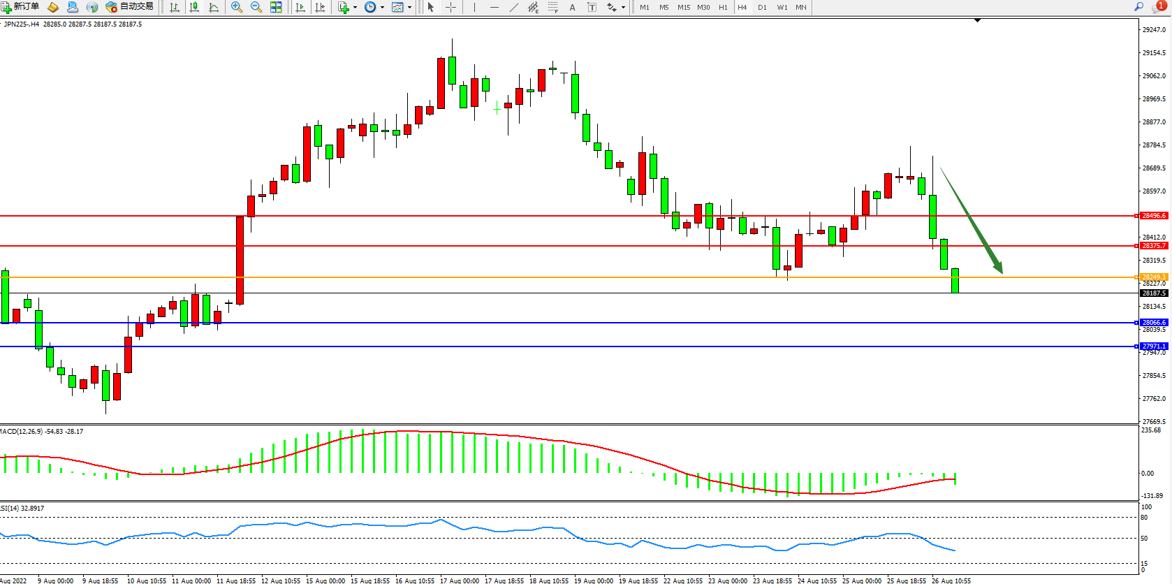 日经指数JPN225——4小时K线图显示: