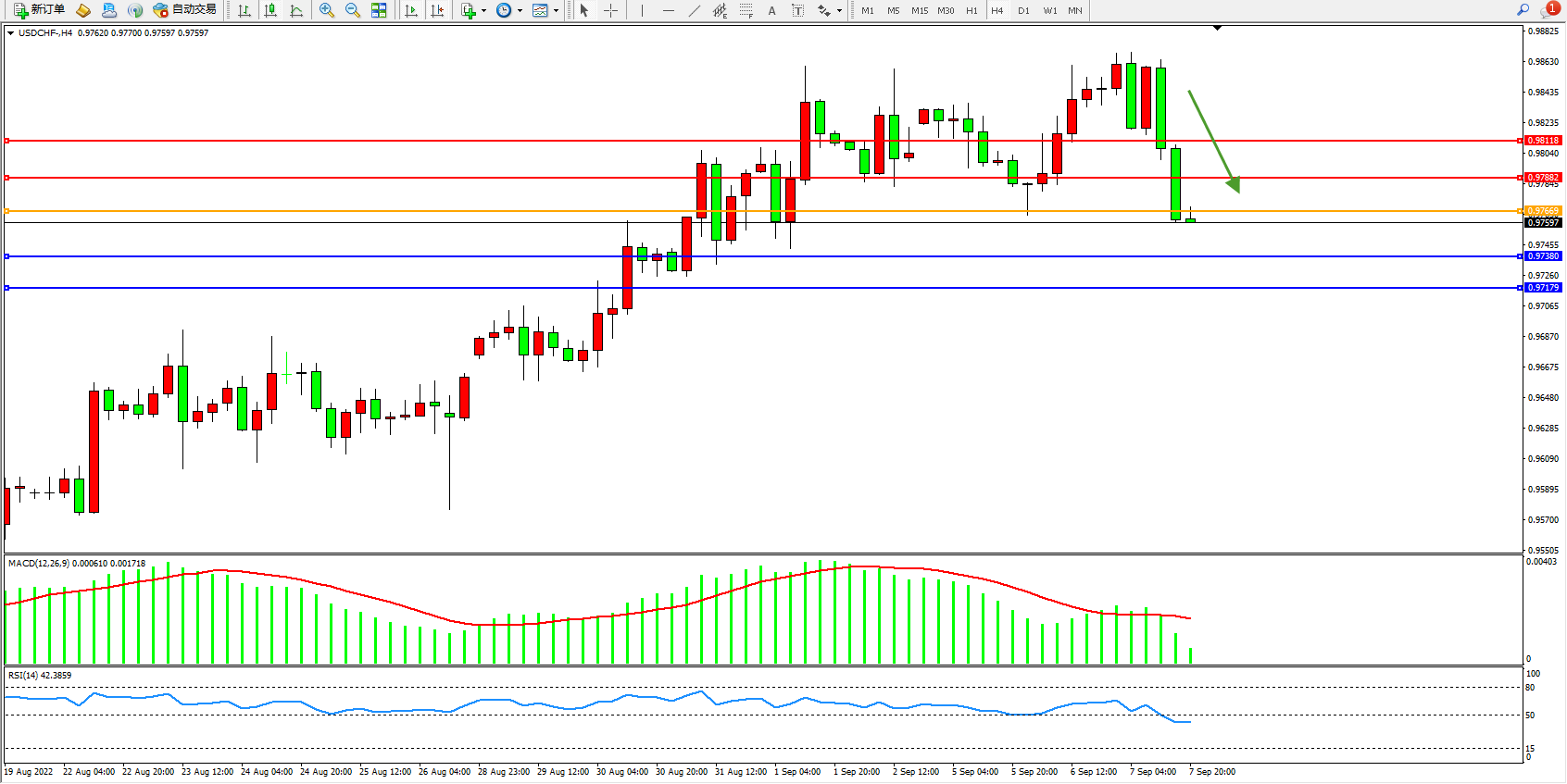 交易策略:0.97669下方看跌,目标0.97380、0.97179