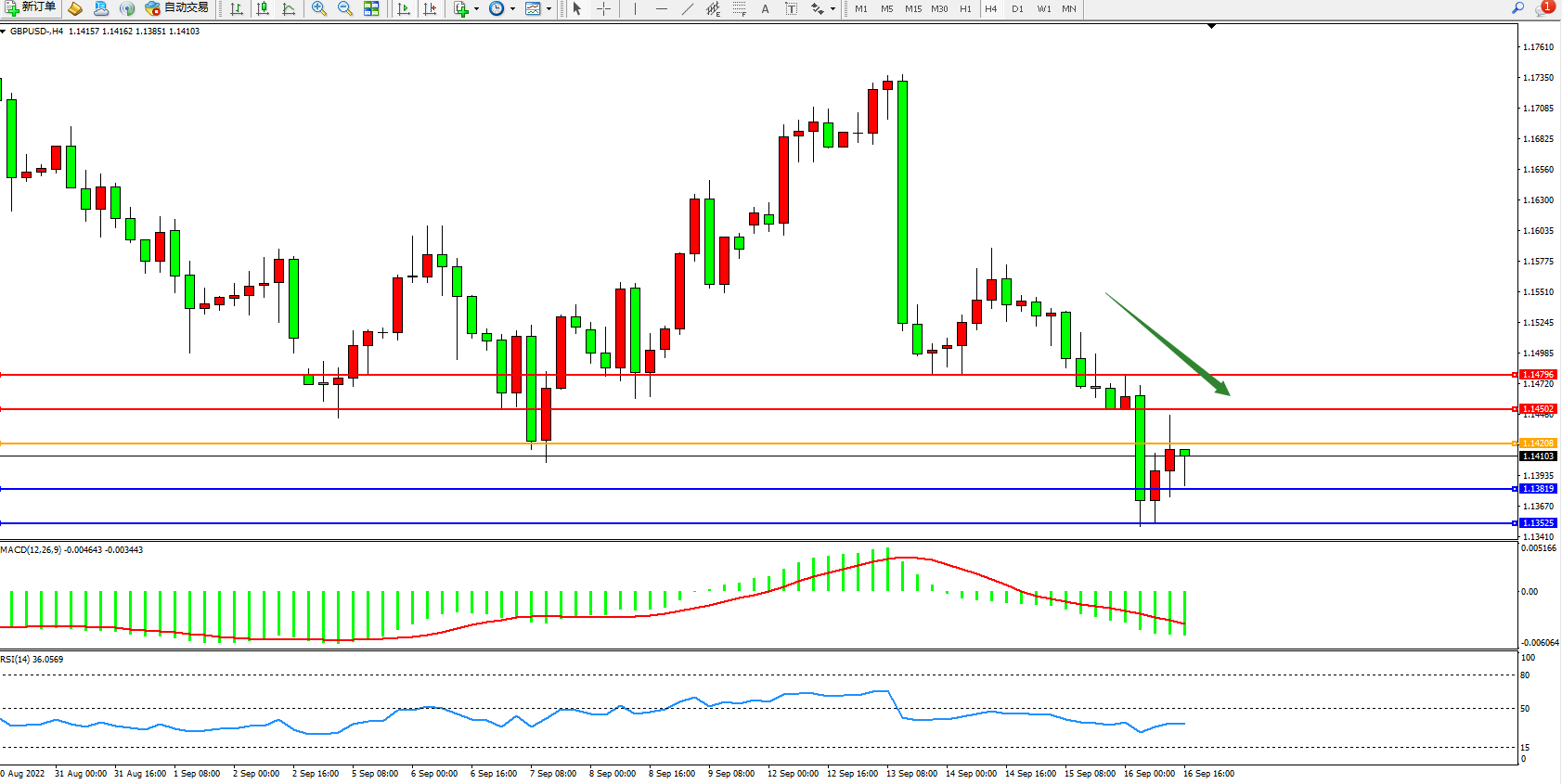 交易策略:1.14208下方看跌,目标1.13819、1.13525