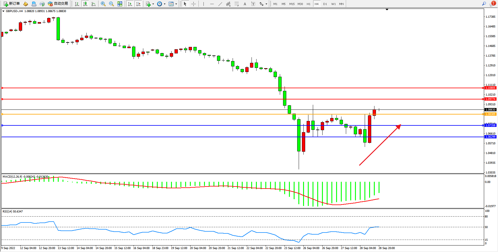 英镑美元GBPUSD ——4小时K线图显示: