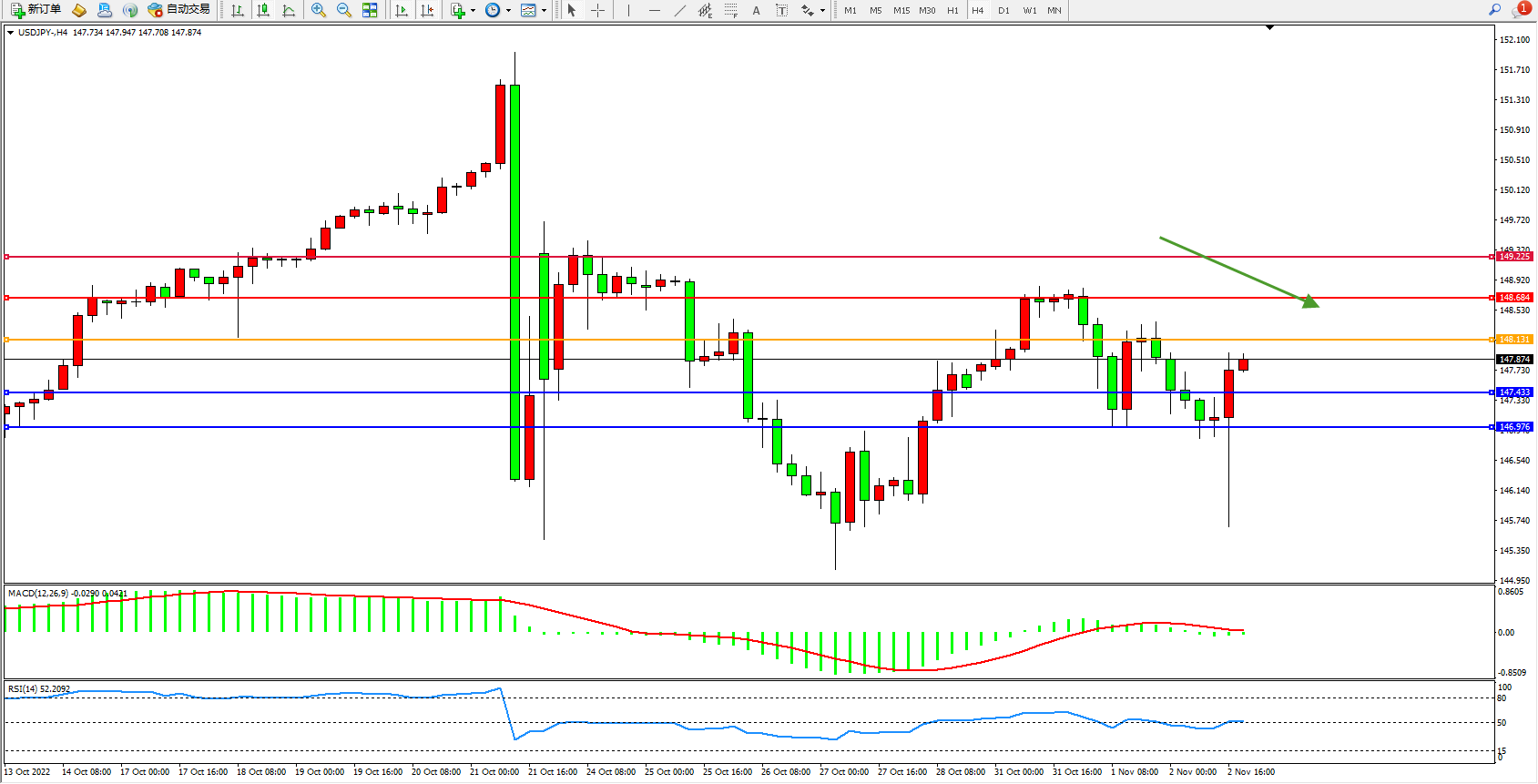 交易策略:148.131下方看跌,目标147.433、146.976