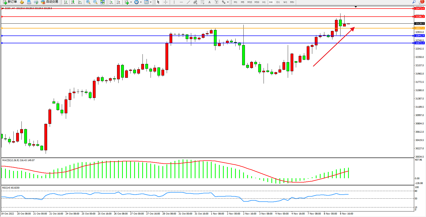 道琼斯指数DJ30——4小时K线图显示: