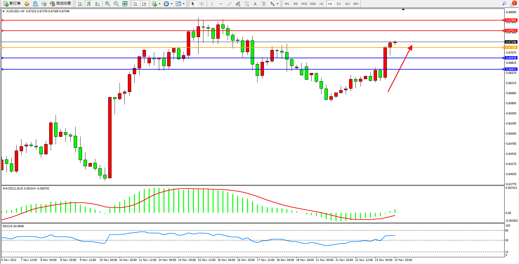 交易策略:0.67200上方看涨,目标0.67623、0.67885