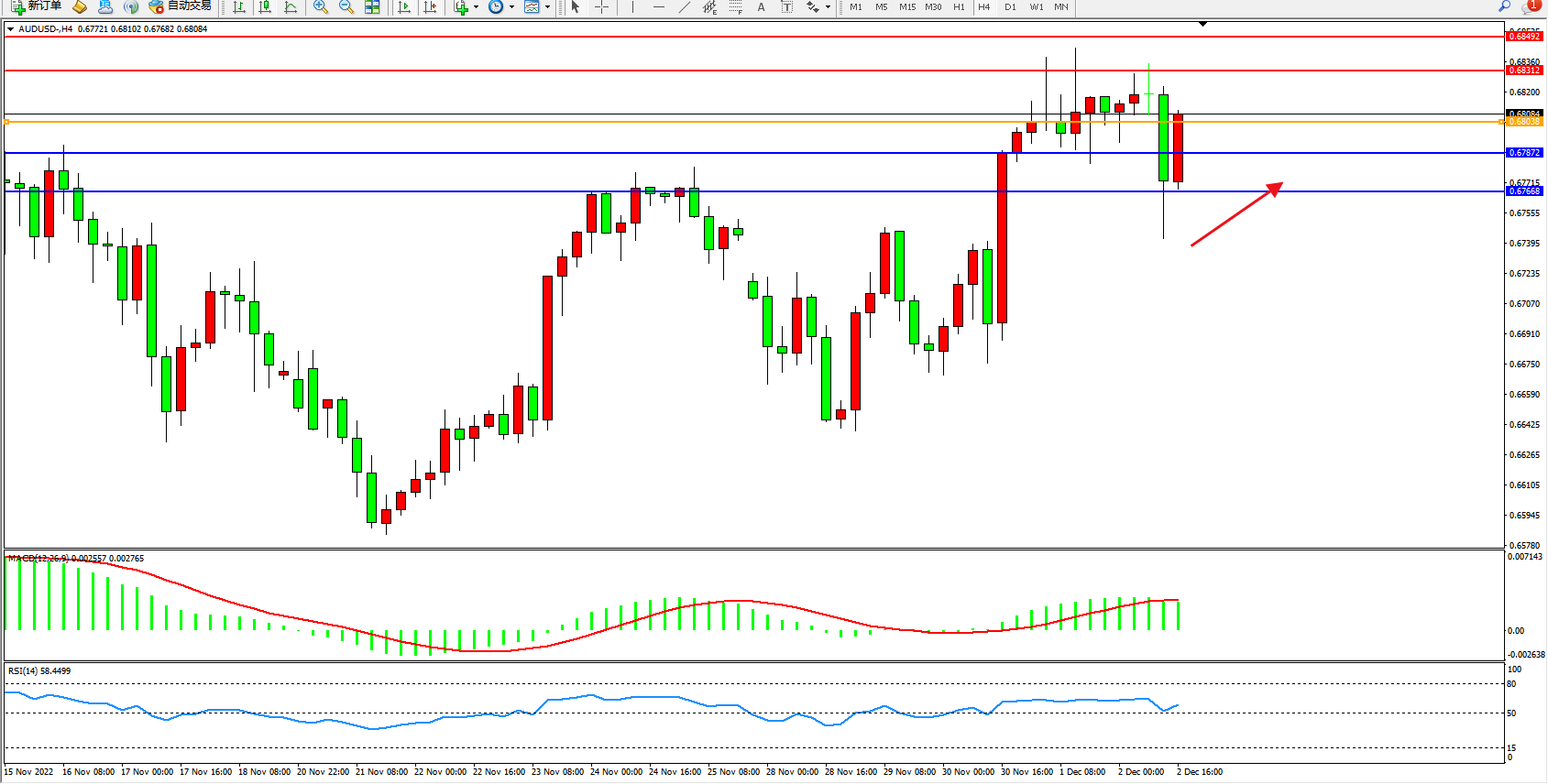 交易策略:0.68038上方看涨,目标0.68312、0.68492