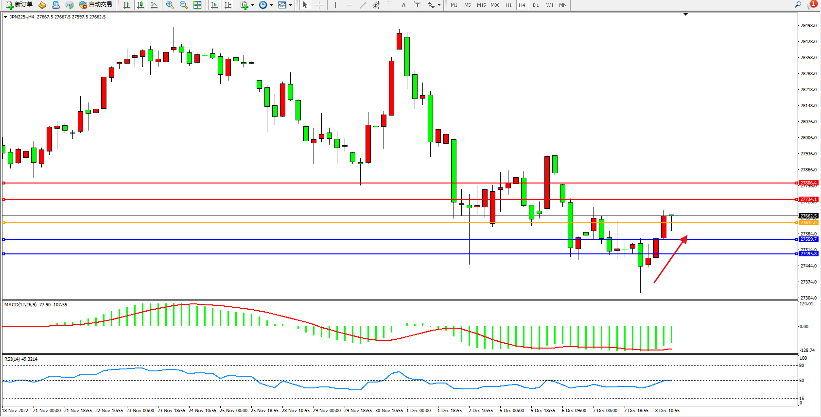 日经指数JPN225——4小时K线图显示: