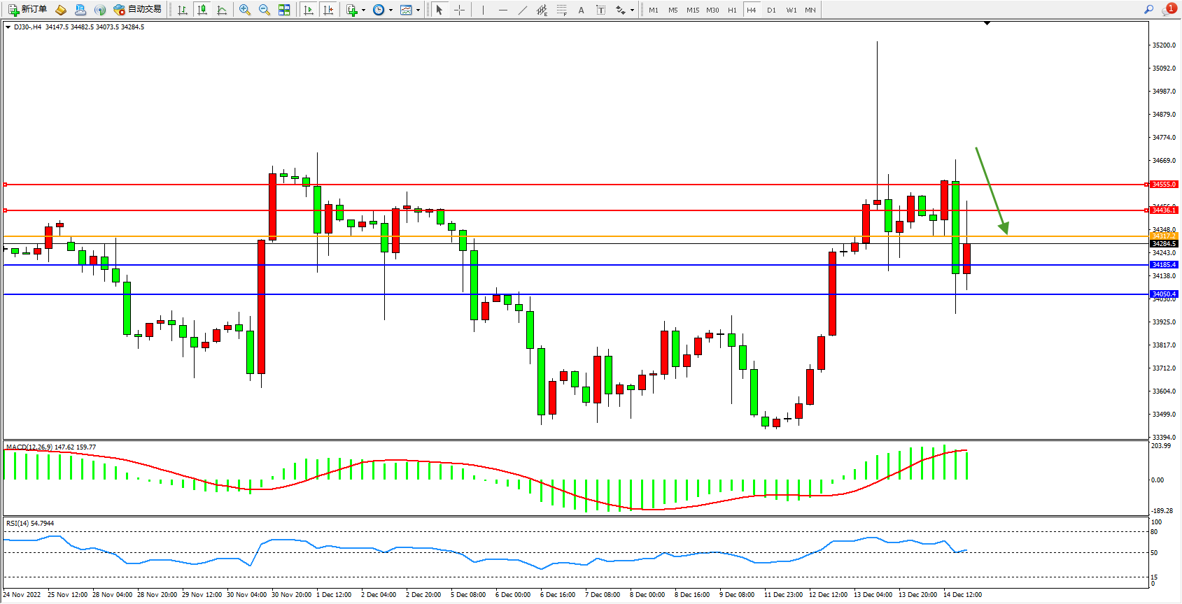 道琼斯指数DJ30——4小时K线图显示: