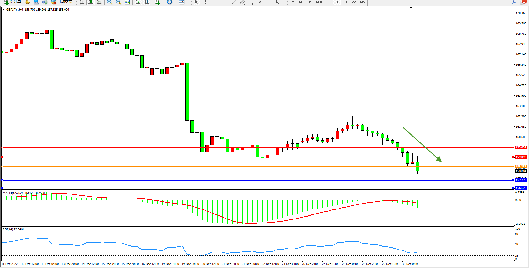 英镑日圆GBPJPY——4小时K线图显示: