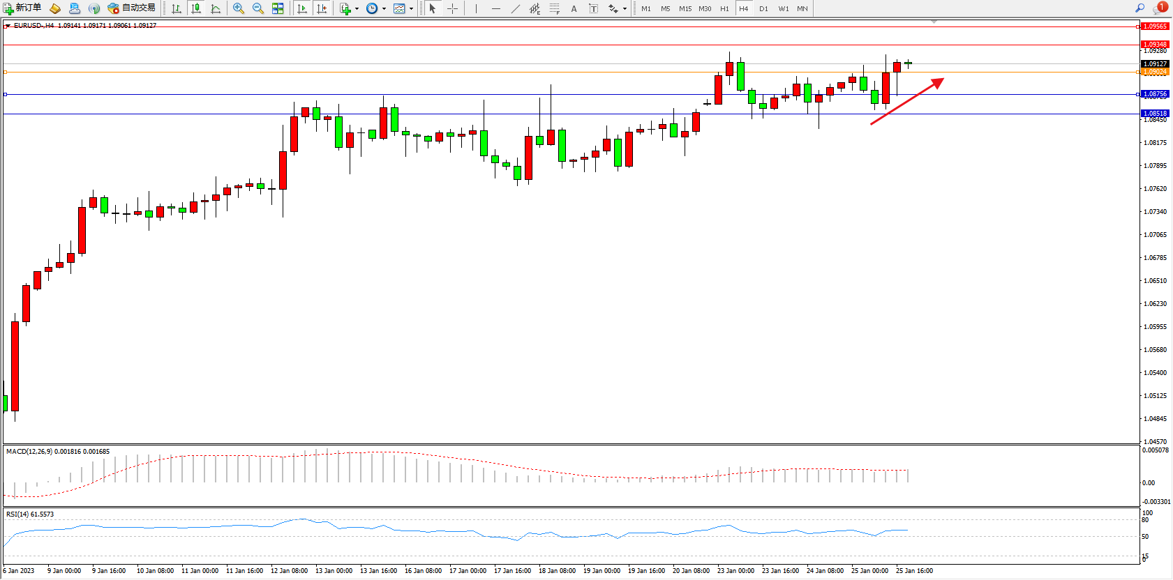 欧元美元EURUSD—4小时K线图显示: