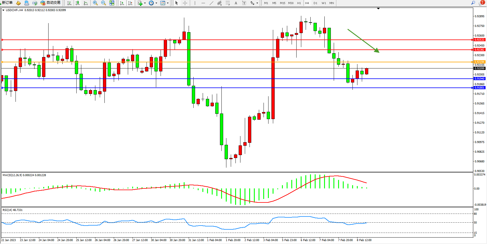 美元瑞郎USDCHF——4小时K线图显示: