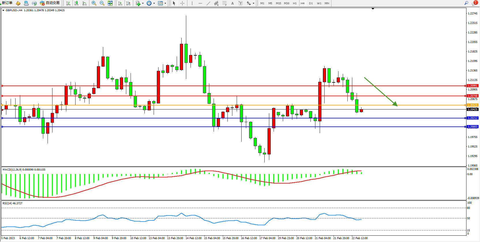 交易策略:1.20525下方看跌,目标1.20212、1.20003