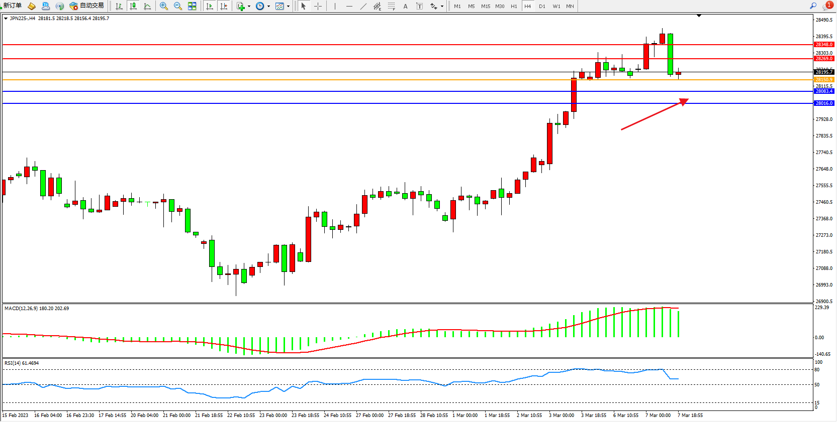 日经指数JPN225——4小时K线图显示: