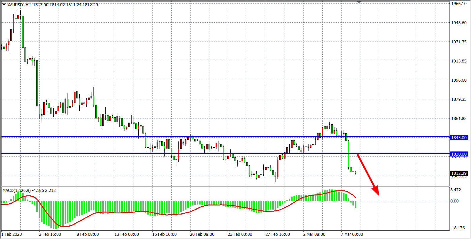 4小时图看,金价跌破1830的低点后再度形成加速,MACD在零轴之下呈放量状态,强支撑1830转化为强阻力,日内在1830之下看跌,下看1800-1780附近。
