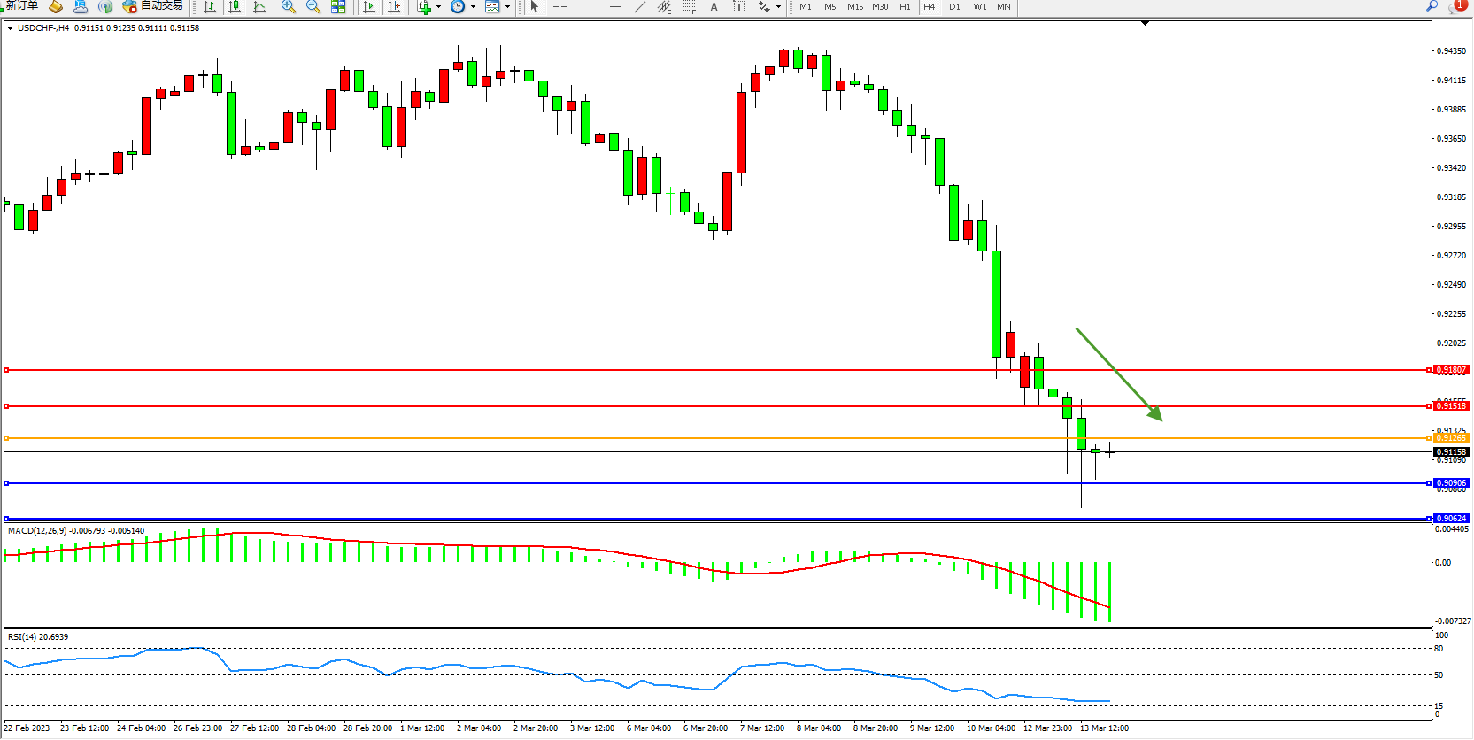 美元瑞郎USDCHF——4小时K线图显示:
