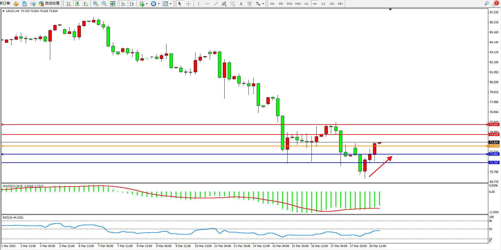 交易策略:73.440上方看涨,目标74.629 75.647