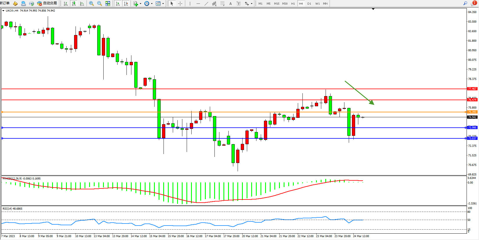 交易策略:75.393下方看跌,目标73.995 73.037