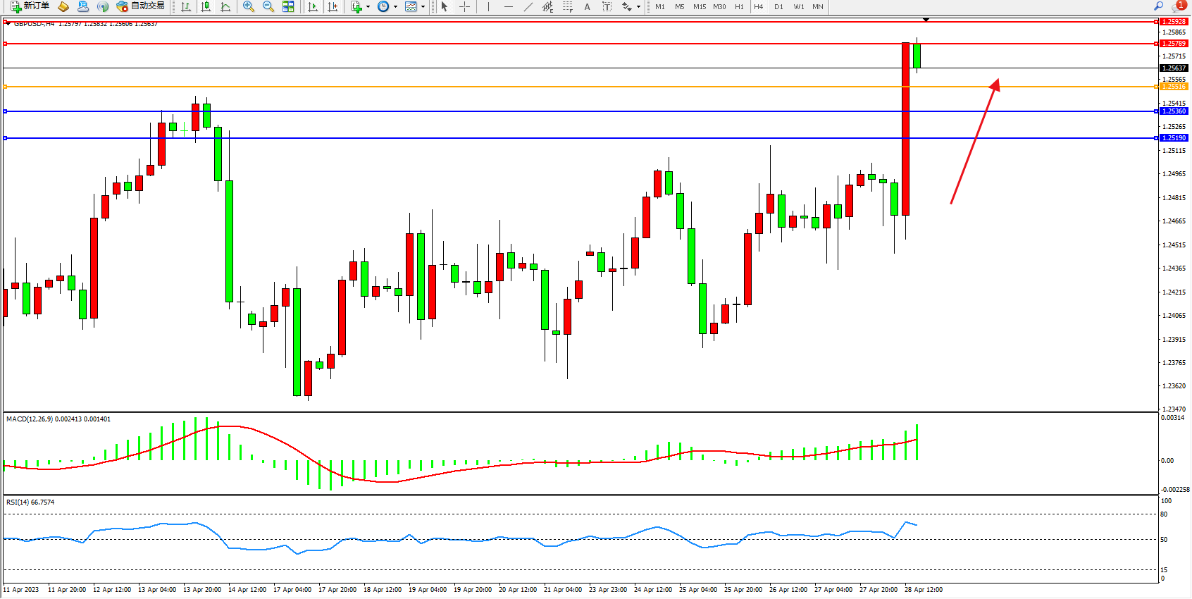 英镑美元GBPUSD ——4小时K线图显示: